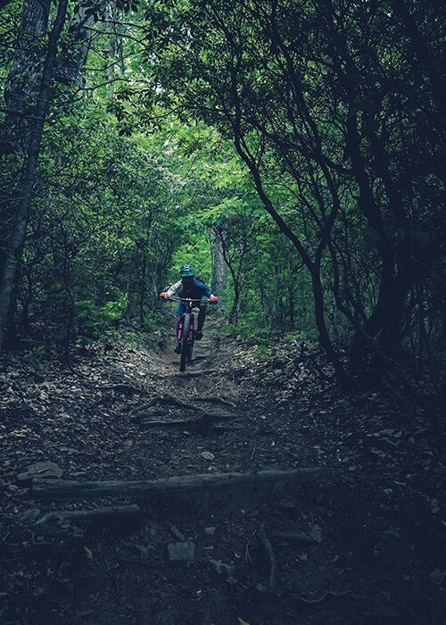 Much of Pisgah riding feels a bit like being in a tunnel due to the large rhododendrons and heavy forest growth, but the high-elevation descents have an airier feel to them. The upper portion of Pilot Rock was a refreshing break from the dense forest riding we had done all afternoon to arrive at the high point. It felt amazing to open things up on the long-travel bike and feel it float through the chunky sections. We re-grouped at the exposed rock feature partway down to enjoy the view and session some lines through the tight switchbacks. We usually just blast down in one adrenaline-filled run, but we wanted to capture images of this trip along the way and play around a bit more than usual. We scouted some optional lines and made the most of what the terrain offered.